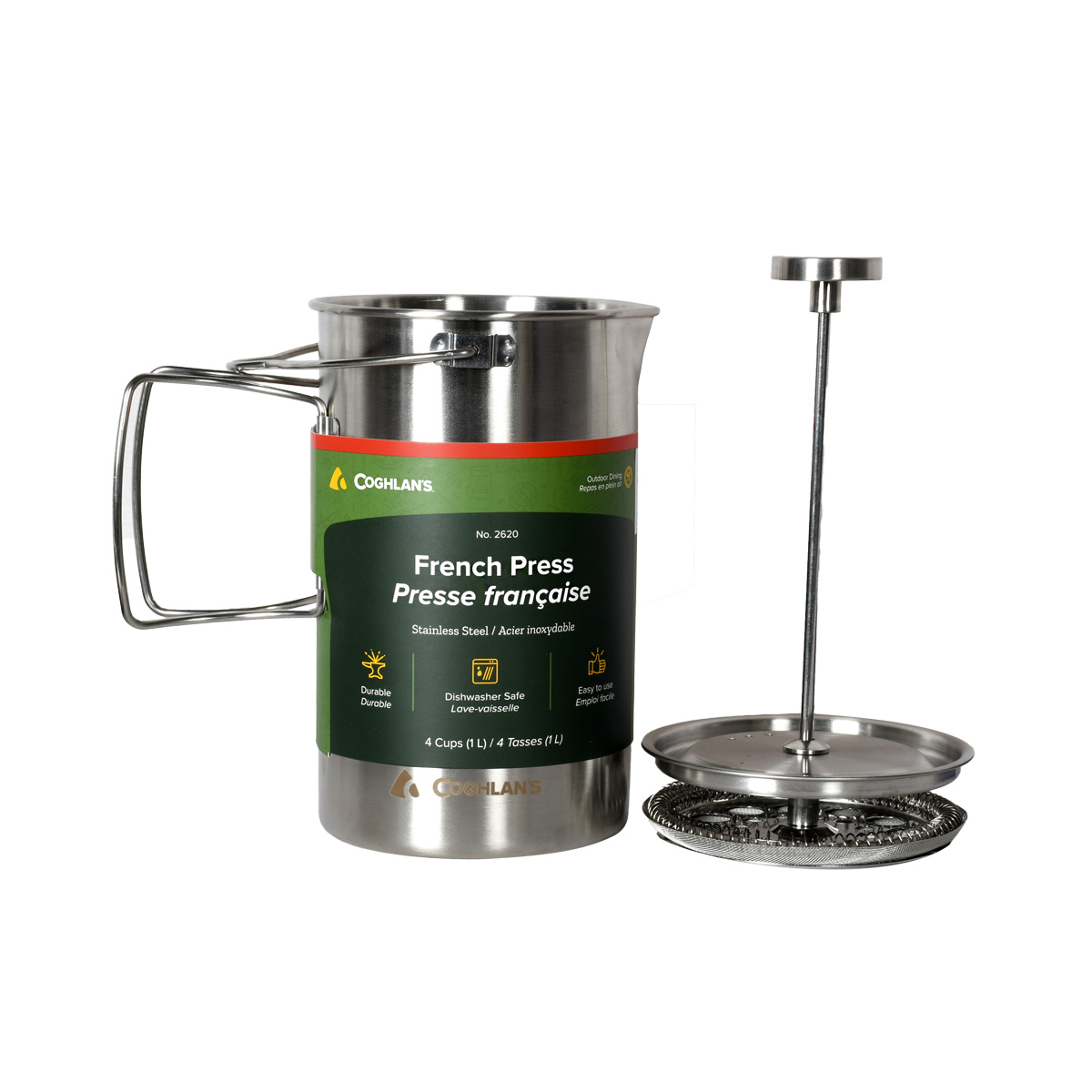 Combining style and durability, this stainless steel French press coffee maker makes it easy to brew rich, flavorful coffee. Its sturdy walls retain heat longer, while its fine filter ensures optimal aroma extraction. For brewing quality coffee on a stovetop or campfire